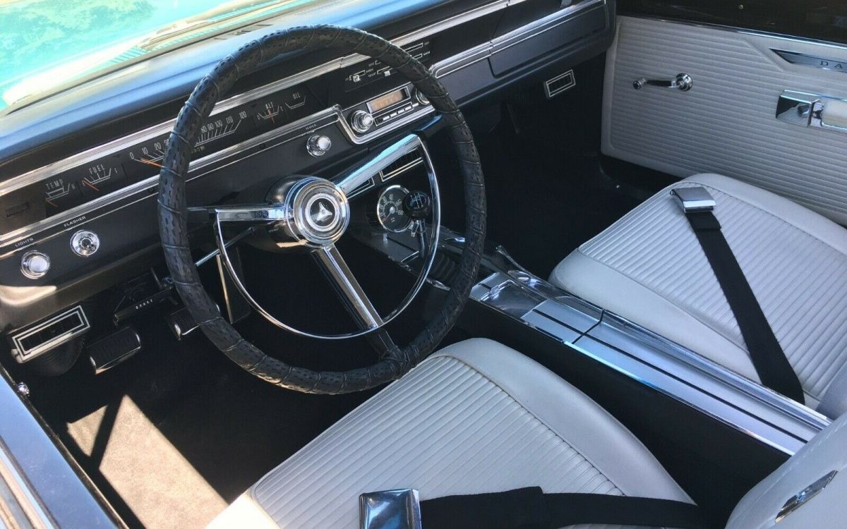 The sharp, crisp styling of the fourth generation Dart said a lot by saying very little. It endured a long run, 1967-1976, but it’s the ’67-’69 that I find most appealing. The seller of this Dart states, “Restored to stock using many restored original, NOS, and correct reproduction parts“. Well, it’s in magnificent condition, that’s for sure, and is absolutely resplendent in its Medium Turquoise Poly finish. Beyond that, the stainless trim and chrome are without fault and the entire package is tied together by period-correct Dodge “mag style” wheel covers – very similar to the pieces that Chevrolet and Ford used during the era. The seller adds that while the body panels are original, “the front footwell sections, center truck pan, and left lower rear quarter behind the wheel were replaced“. I’d say that the exterior needs nothing.