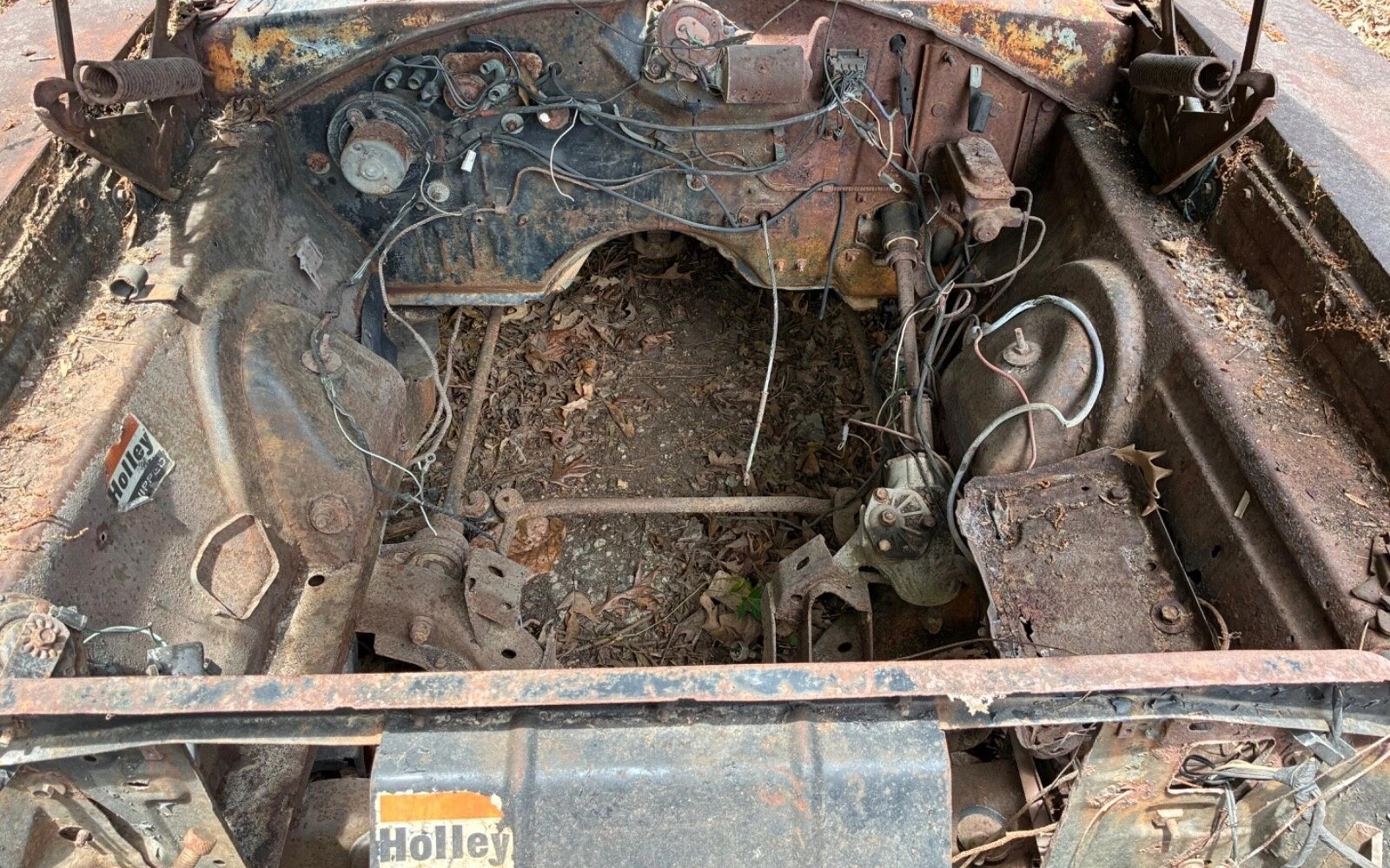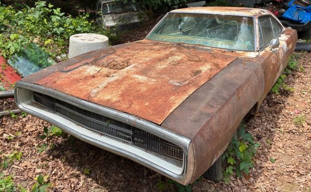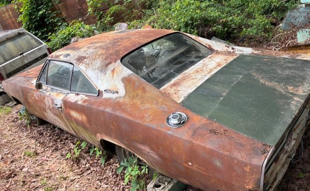 The seller calls his Charger a barn find, but with all the rust and patina, this one must have spent decades outside before ever finding its way into the safety of a barn, and made an exit from those confines a while ago, judging from how far the tires have sunk into the ground. The fender tag indicates a color code of TX9, black, but you’d never know it from looking at the outside now, especially with the green trunk lid. Rust on the lower quarters is specifically mentioned, so those will for sure need repairs, but hopefully some of the other panels will be salvageable.