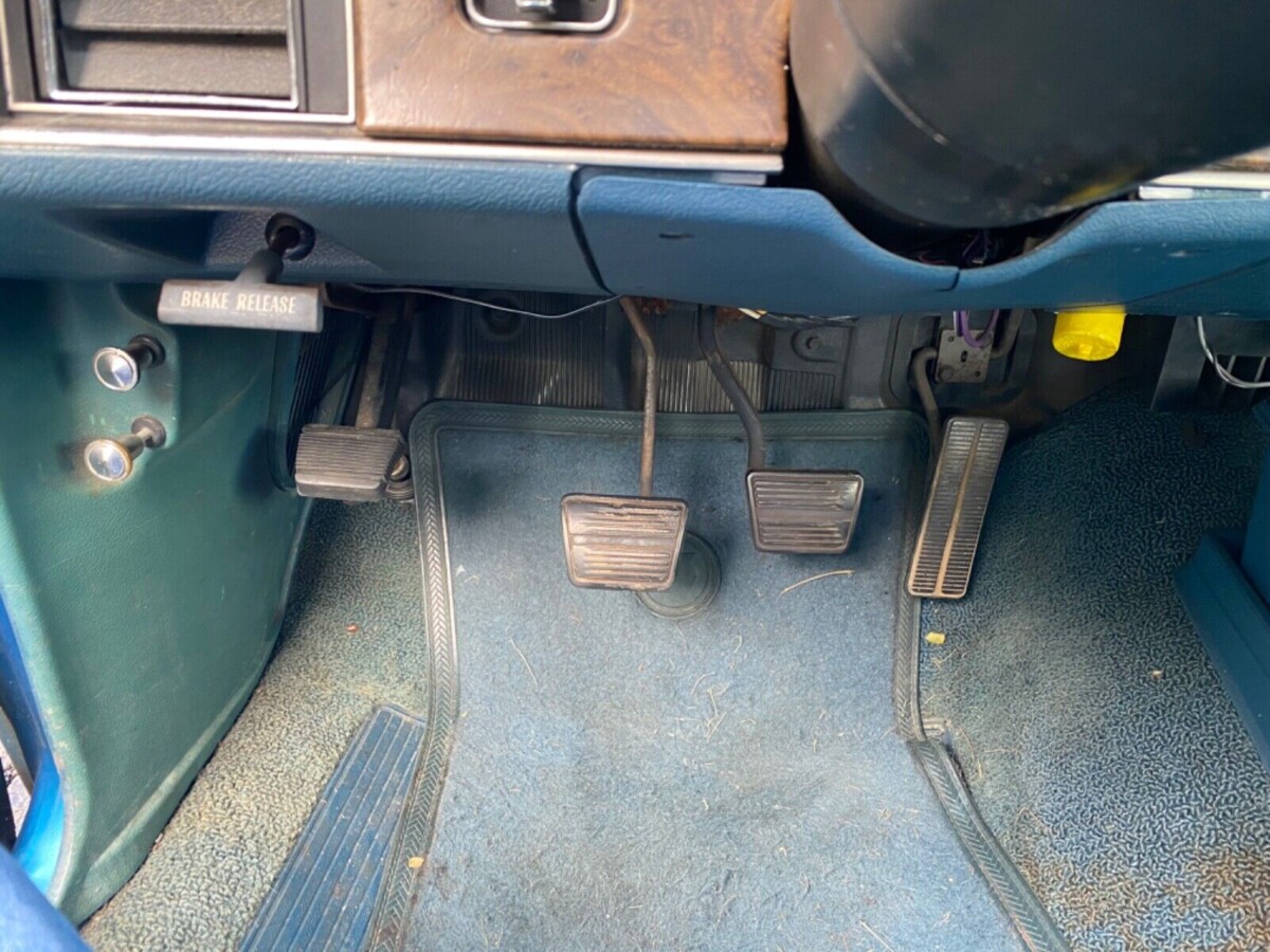 Bargain Basement Special with full gauges including tach and 8-track? I hardly think so. This is a very appealing car with original seat cloth surviving in amazingly good condition and it’s pretty obvious the buyer wanted traditional six-passenger seating capacity whilst retaining a manual shift. Probably ordered by an older gentleman who had no interest in slushboxes but appreciated the classic-era reminiscent style of this Mulsanne Blue stunner. The Deco-inspired original hubcap evidenced in the trunk backs that up.