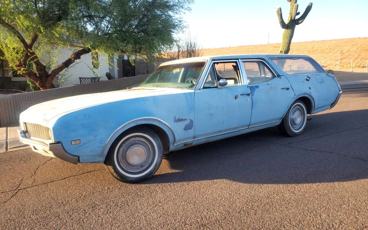 Whatever version of blue paint this wagon once had has now faded to being nearly white thanks to the desert sun. It’s mostly rust-free, with just two spots in the lower front fenders. The interior looks dried out, including the front seats and door panels. While this Olds has a 350 cubic inch V8 (no pics), there is no power steering, further adding to the likelihood this is a rare wagon. The seller says delivery is available, but we assume there’s a mileage limit to negotiate. If you’re into vintage station wagons and want something a bit unusual, why not fix this one up a little more and take it to Cars & Coffee?
