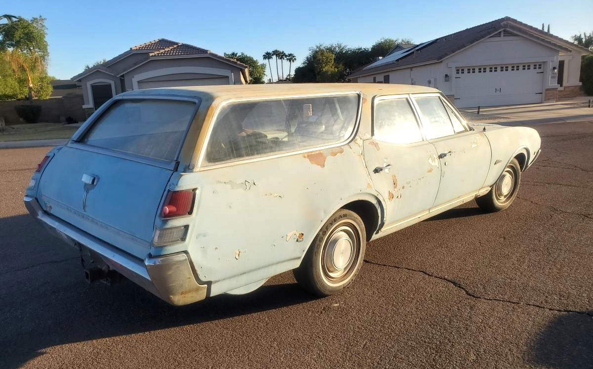 This would be a cool car to restore or make drivable. Smooth roof Cutlass Cruisers are almost never seen. These cars are lighter than you think. The manual steering is wide ratio and not as bad as you think.
