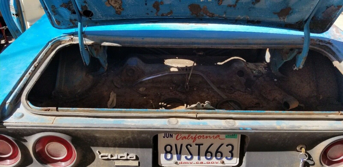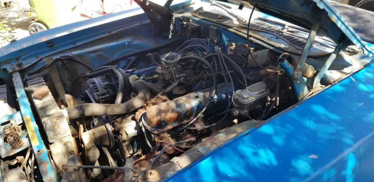 The seller has owned this Plymouth for about two years, and we assume he bought it to restore but has changed his mind. It’s wearing Street Basin Blue paint, not a common color on Barracudas in 1973, It once had a white vinyl top, which has largely peeled away, and a white interior, which has been damaged over time by the lack of a windshield or back glass. While we’re not alarmed by rust, there are dents in the body including one from a hit taken from a fallen tree branch. The seller’s enclosing the sheet metal needed to make those repairs, along with a new back window.