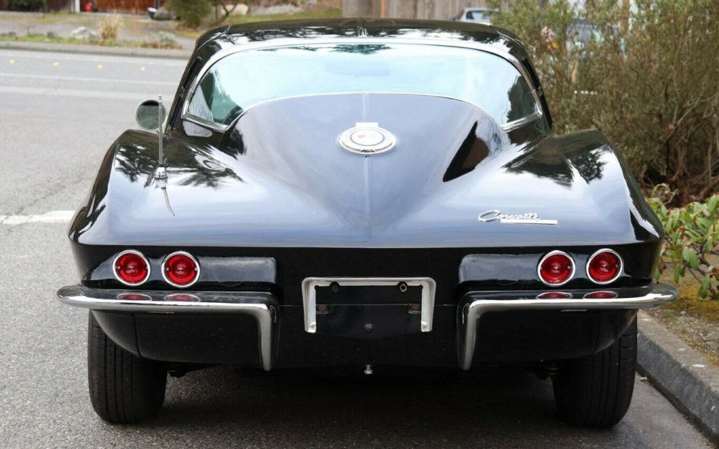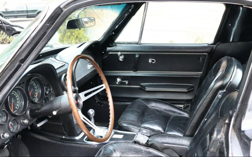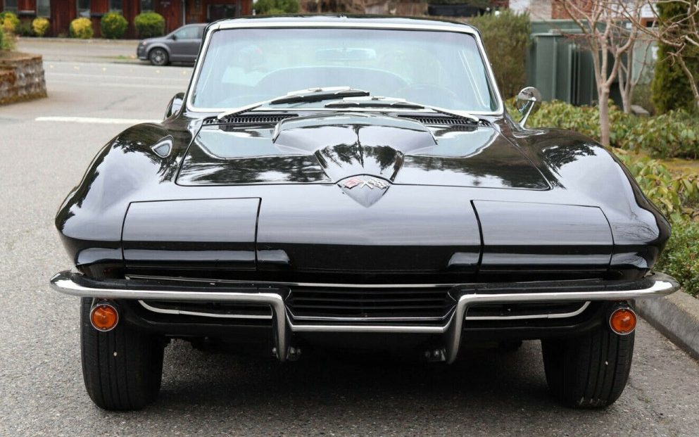 Tuxedo Black is considered a rare color for ’65 though there were 1,100+ examples produced. That said, it was the least selected color with Nassau Blue coming in first. And speaking of black, this Corvette is resplendent in its Tuxedo. Black is a tricky color, it will show, and magnify, every ding, depression or wave, – a trait that sometimes occurs along a Corvette’s bonding strips and header panel. That’s not the case here however, the seller doesn’t detail the age of the finish other than to say, “older paint” so it’s probably an older repaint but regardless, the images show no issues. Some may consider the white-stripe tires to be quaint while others might think that they are completely incongruous on a car like a C2 ‘Vette but they were a typical 1965 option with 19K buyers anteing up. Also of note, is the first year “hood stinger”, it would be repeated in ’66 and then changed for ’67.