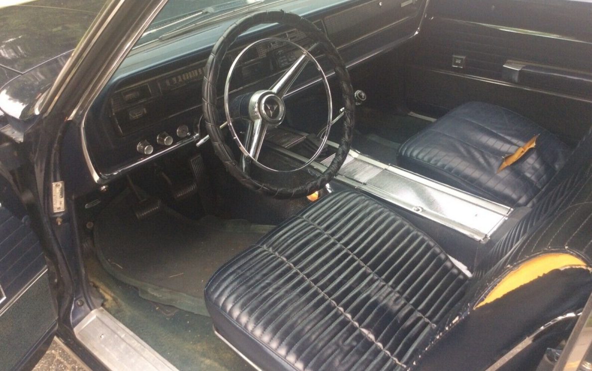 The interior is in need of help. The black vinyl seat upholstery is kaput and the carpet is not far behind. The dash pad, however, is split-free and the instrument panel gauges all work as intended with the exception of the fuel gauge. The center console appears to be in great shape; it is a wide expanse of stainless or aluminum trim and they are subject to dents and scratches but that doesn’t appear to be the case here. Of note are the power windows, helpful in a convertible, but not seen that often in 1966 – the master switch, however, is on the fritz. And as is frequently the case with a convertible from the ’60s, there is no A/C. Finally, the original radio has been replaced with an aftermarket unit.