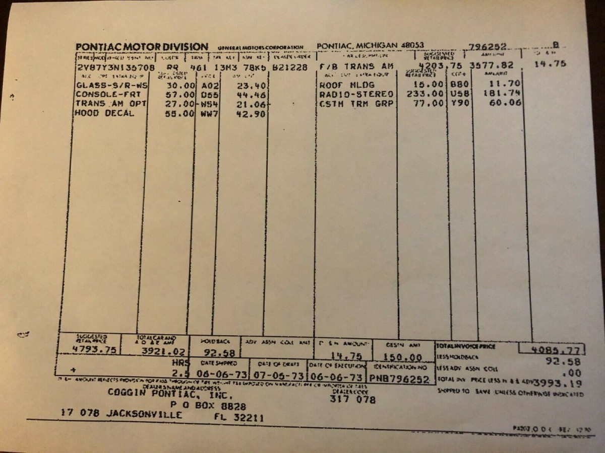 This car was originally delivered and sold at Coggin Pontiac in Jacksonville, Florida. It was not heavily optioned but did come with tinted glass, center console and the $55 hood decal which was first offered in 1973. From 1970-1972, Pontiac only offered the Trans Am in Cameo White with a blue stripe or Lucerne blue with a white stripe. In 1973, Pontiac opened up the color palette and offered Trans Am in Buccaneer Red, Cameo White and Brewster Green. Unfortunately, there are no pictures of the interior of this car but the ad says that the interior is nice and the dash is not cracked. However, the seating is not correct, the car needs new door panels and the console is missing.