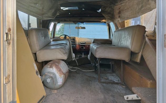 There isn’t much luxury here, but I’m sure a modern RV conversion company could outfit this bare-bones rig for luxury living if that’s what the next owner wants. I’d keep it simple, just so it’s leak-free and has a place to sleep, I’m good. There should be a little stove and refrigerator behind that leaning door.