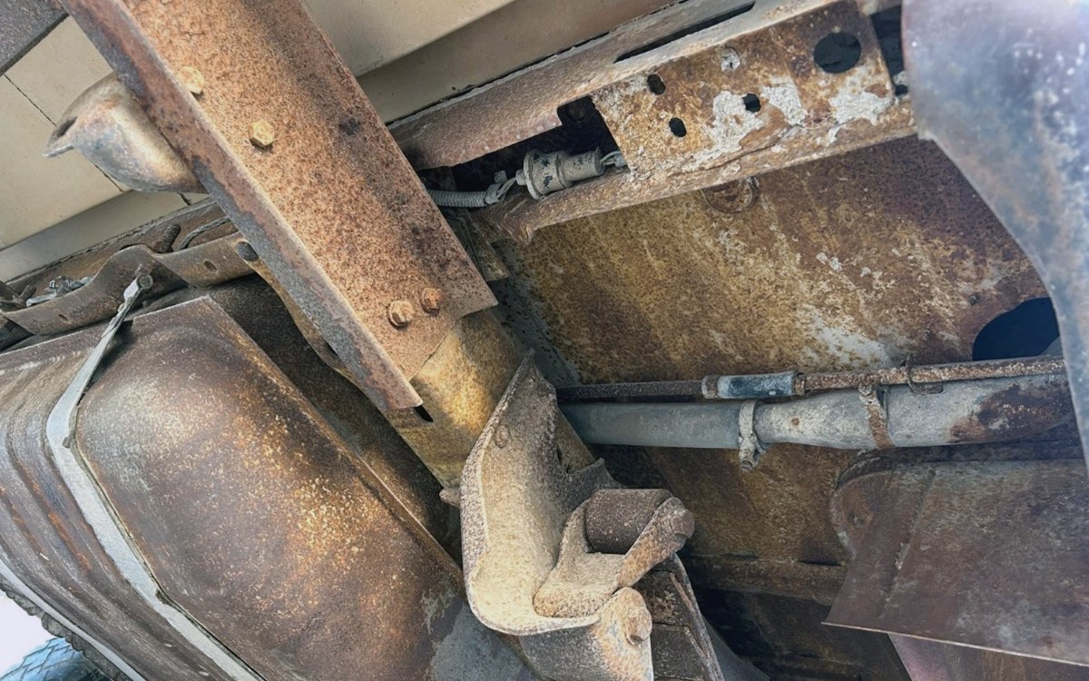 You can see that there is a lot of body rust on this Blazer, but the underside looks surprisingly solid. Like wearing a heavy coat in Everest, Kansas in January and February, when the average low temperature is 16 to 20 degrees F, the underside is wearing a heavy coat of surface rust and will no doubt be blasted and painted during the full restoration that this Blazer/Chalet combo deserves. Yes, that’s the rear door sitting on the floor inside the Chalet camper, along with a few other things. They say the Blazer was originally a burnt orange color, which may be a little easier on the eyes than this two-tone dark brown and tan.