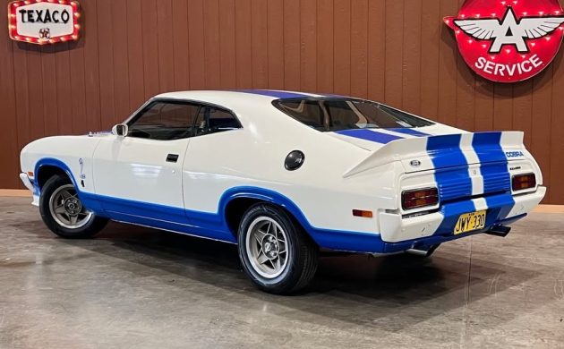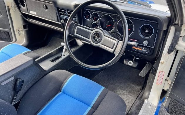 Eagle-eyed readers will immediately draw comparisons between our feature car and The Interceptor from Mad Max. This is understandable because the Falcon XC was a mildly facelifted version of the previous XB model, which was the vehicle used by George Miller to produce the iconic movie car. Ford Australia had made it public knowledge in 1978 that it had an entirely new model, codenamed “Blackwood,” set for release in 1979. Its latest offering would be available as a four-door Sedan, Station Wagon, Van, and Ute. There was no scope for a Hardtop variant due to the largely European styling, and with sales of such vehicles essentially falling off a cliff after 1975, justifying the development costs proved impossible. However, the company found itself in a bind as 1978 dawned because it had 400 surplus Hardtop bodyshells for its existing XC model gathering dust in its Parts Department. So, what to do? Edsel Ford II was Managing Director of Ford Australia at the time, and he had a lightbulb moment. The company would produce 400 examples of a Falcon Cobra, all with numbered dash plaques. It was a fitting end for the Hardtop and would also leverage the previous year’s racing success for the Moffat Ford Dealer Team that had swept to crushing victories in the 1977 Australian Touring Car Championship and Bathurst 1000. Edsel decided that the limited edition should recapture the look and feel of the North American Cobra models, which is why buyers received their cars finished in Sno White with contrasting Bold Blue stripes. Except, not all is as it seems, because Ford Australia painted each body Bold Blue, overlaying the Sno White paint and subtle Olympic Blue separating stripes during a second run through the paint shop. It seems like a complicated process, but the extra layer of paint was probably a good thing since rust could be a problem with the Hardtop body. The Cobra package also included front and rear spoilers, unique vinyl decals, and 15″ Globe “Bathurst” alloy wheels. The seller states that apart from a minor touch-up on the rear quarter panel, this Cobra is original and unrestored. It presents exceptionally well for its age, with no significant panel or paint imperfections and no evidence of rust. The underside shots confirm that the floors are spotless, and those beautiful alloy wheels are seemingly flawless.