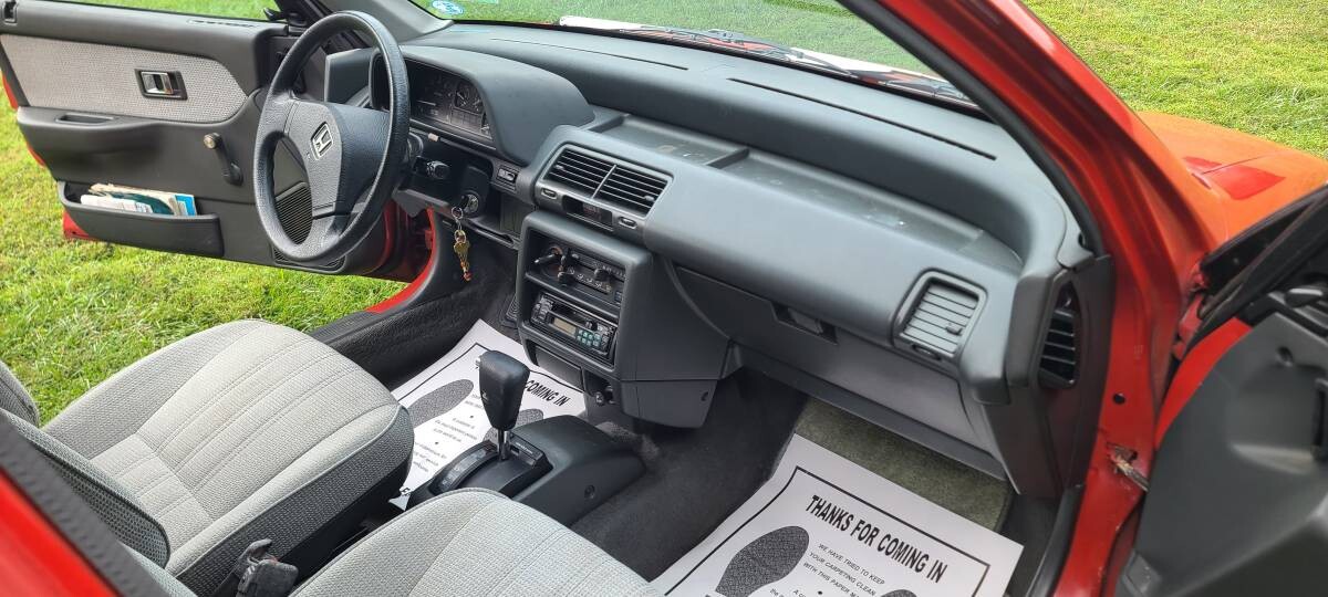 The Rio Red paint over white-painted steel wheels was perhaps the most recognizable configuration for picking an RT4WD model out of the crowd. The body shows evidence of gray primer in places, specifically above the inner fender arches on both sides. These spots were rust-prone on 80s and 90s Hondas, so I’d want to ask whether the primer is due to a proper fix of a rust issue or if it’s simply masking a problem that will eventually have to be addressed. The body otherwise appears to be in very good condition, but given most of these Civics 4WDs were used in snowy climates, I’d want to poke underneath to see if there’s evidence of spending a few years up north.