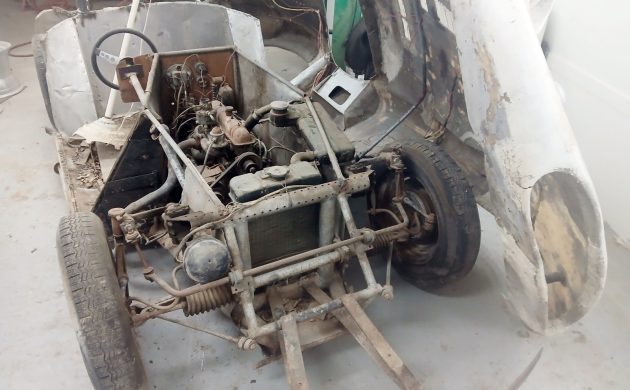 Fiberglass doesn’t rust, but it cracks and gets mangled in accidents. This one appears to have escaped that fate. The new owner might want to abandon that filthy and undoubtedly broken chassis that comes with the Devin body and put it on something more substantial.