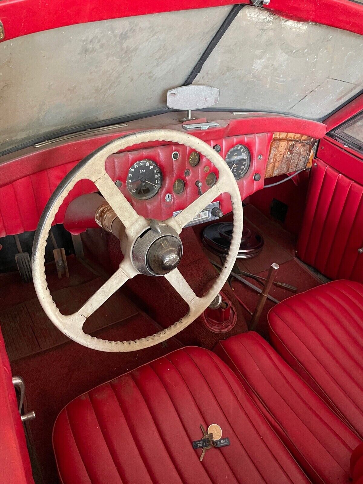 The interior was recovered in the 1960s in red vinyl, including the dash. A portion of the material was cut away to reveal the walnut beneath. Resurrecting the original dash might be impossible but at least remove that horrid vinyl! It buries the gauges and probably makes the switches balky. The seller indicates the top is intact but too shrunken to use. The tool kit is present.