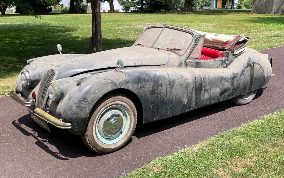 Barn Finds has featured many a derelict Jaguar XK, but only one XK120 drophead coupe (DHC) in the last eight years. That’s because just 1769 dropheads were made in the XK120 series during 1953 and 1954, out of more than 12,000 examples of all body styles. While the roadster had rudimentary and inconvenient weather equipment, and the fixed head lacked open-air appeal, the drophead offered a comfortable compromise, with roll-up windows, opening vent windows, a heater, and a convertible top attached to the rear cowl. For fans of the Big Cat seeking an example of this rare body style, here on eBay is a 1953 Jaguar XK120 drophead coupe barn find with an asking price of $55,000. Last prowling the road in 1966, the car has been stored on blocks since then. You’ll have to trailer it to its new garage from Harleysville, Pennsylvania. Better hurry, though – even at this price the listing has 21 prospective buyers watching it. We have Russell Glantz to thank for spotting this car – thanks, Russell!