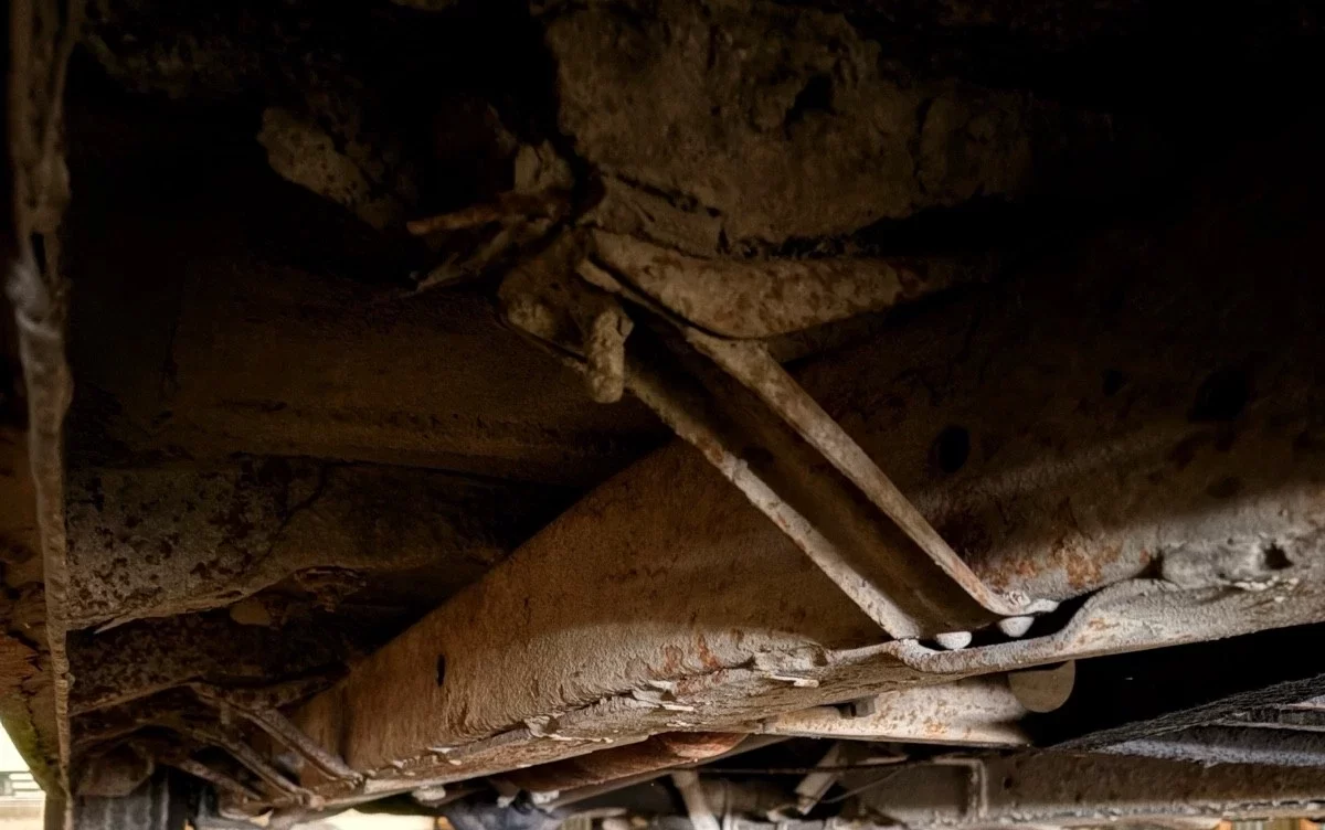 Underneath, things look…old and dirty. The seller says that there is no invasive rust, just surface rust underneath, although the pictures included in the ad are dimly lit and not too revealing.