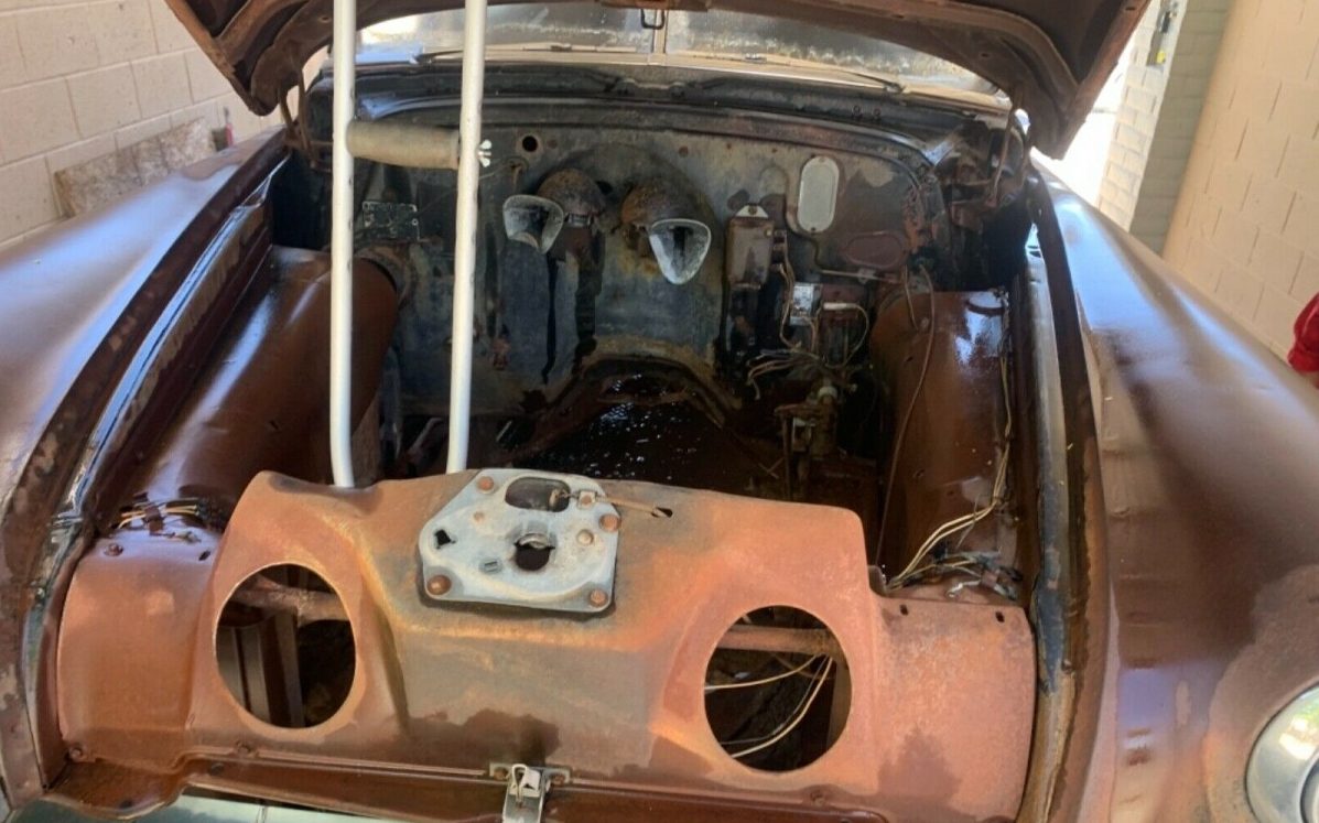This Pontiac is a roller (OK, cue the “Put an LS in it” suggestion). The original engine, either a 90 HP, 239 CI in-line six, or an optional 104 gross HP, 249 CI, in-line eight-cylinder engine is lost to the ages. Standard shifting happened via a three-speed manual gearbox though GM’s Hydramatic automatic was available on the options list. I suppose this situation helps to make this Pontiac a blank canvas going forward. Oh, and note the hood prop!