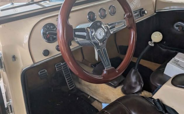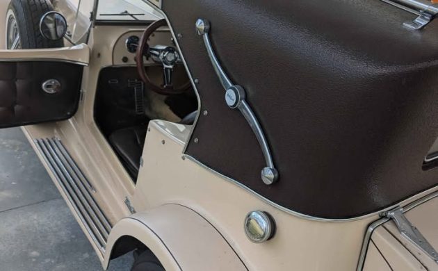 Based on the photos, the Mini Mark’s exterior appears to be in good shape with its beige paint looking decent along with the complimenting brown pinstriping. Many other ’30’s-era styling cues are incorporated including running boards, chrome grill and headlamps, wire wheels, dual spare tire holders on the front fenders, and a removable hardtop with a luggage rack and the full landau look, including a half vinyl roof and ornamental S-shaped bars. Snaps for side curtains are visible, but it’s not known if a set comes with the car or not.
