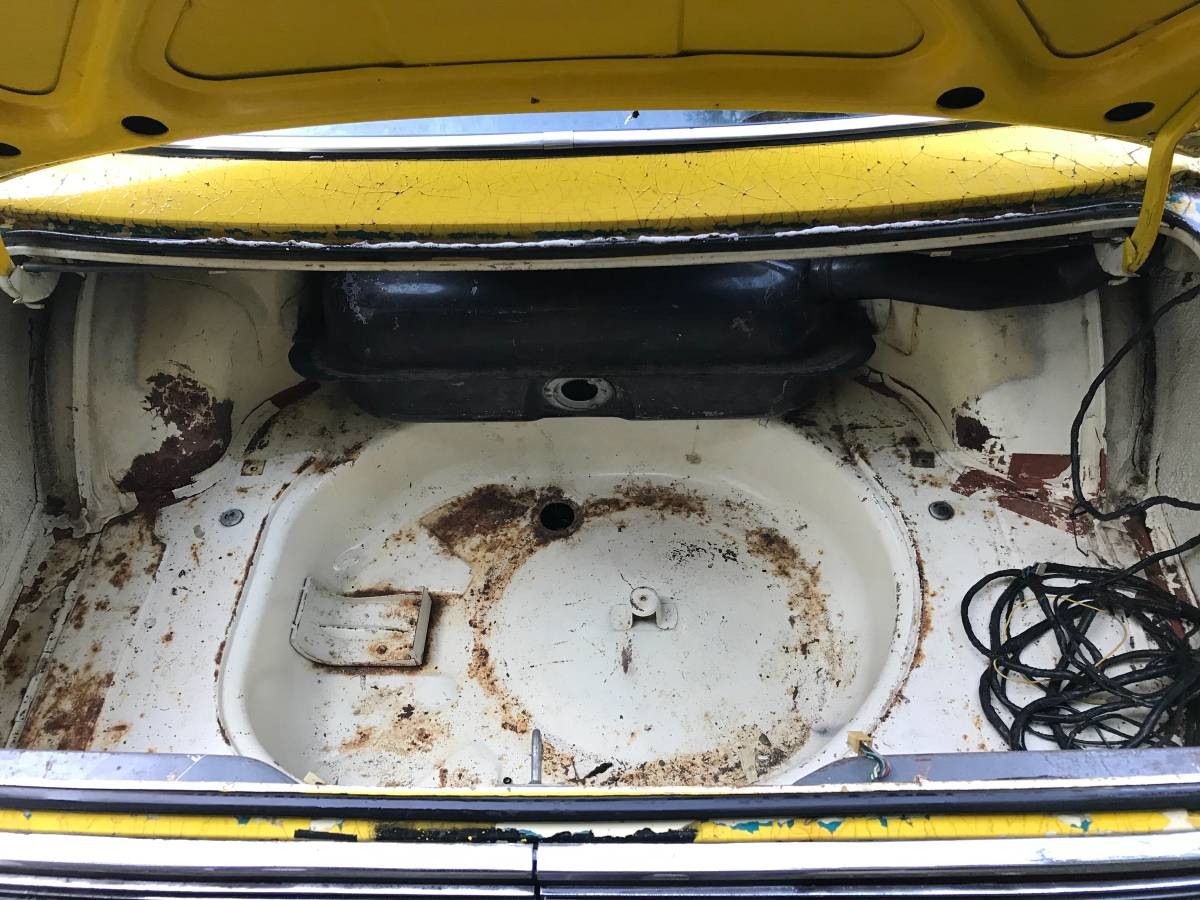Paint on the body is yellow, paint in the engine bay is blue, and paint in the trunk is white. Was this three cars welded together?