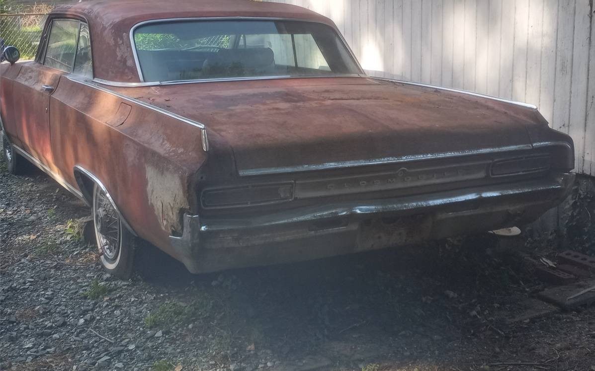 More of a ford /import guy , but the 60s oldmobiles were sharp. Sure hope some one saves it. When I was very young my grandfather had a gold 4 door that looked a lot like this. I was pretty young so not sure of exact year or model