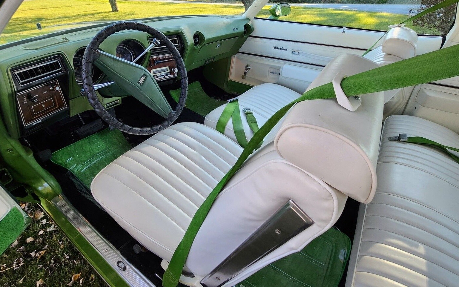 Good luck finding a green steering wheel cover today, much less green steering wheel for this. Or even aftmkt green rubber floor mats, let alone correct OEM reproduced green floor mats