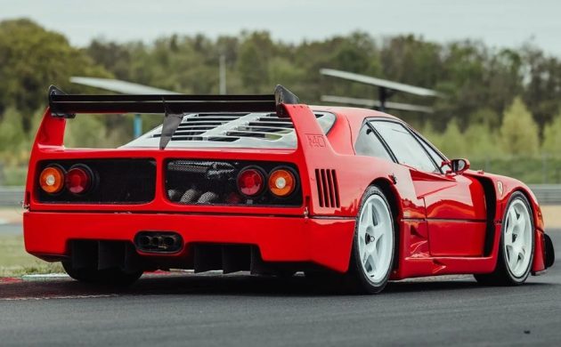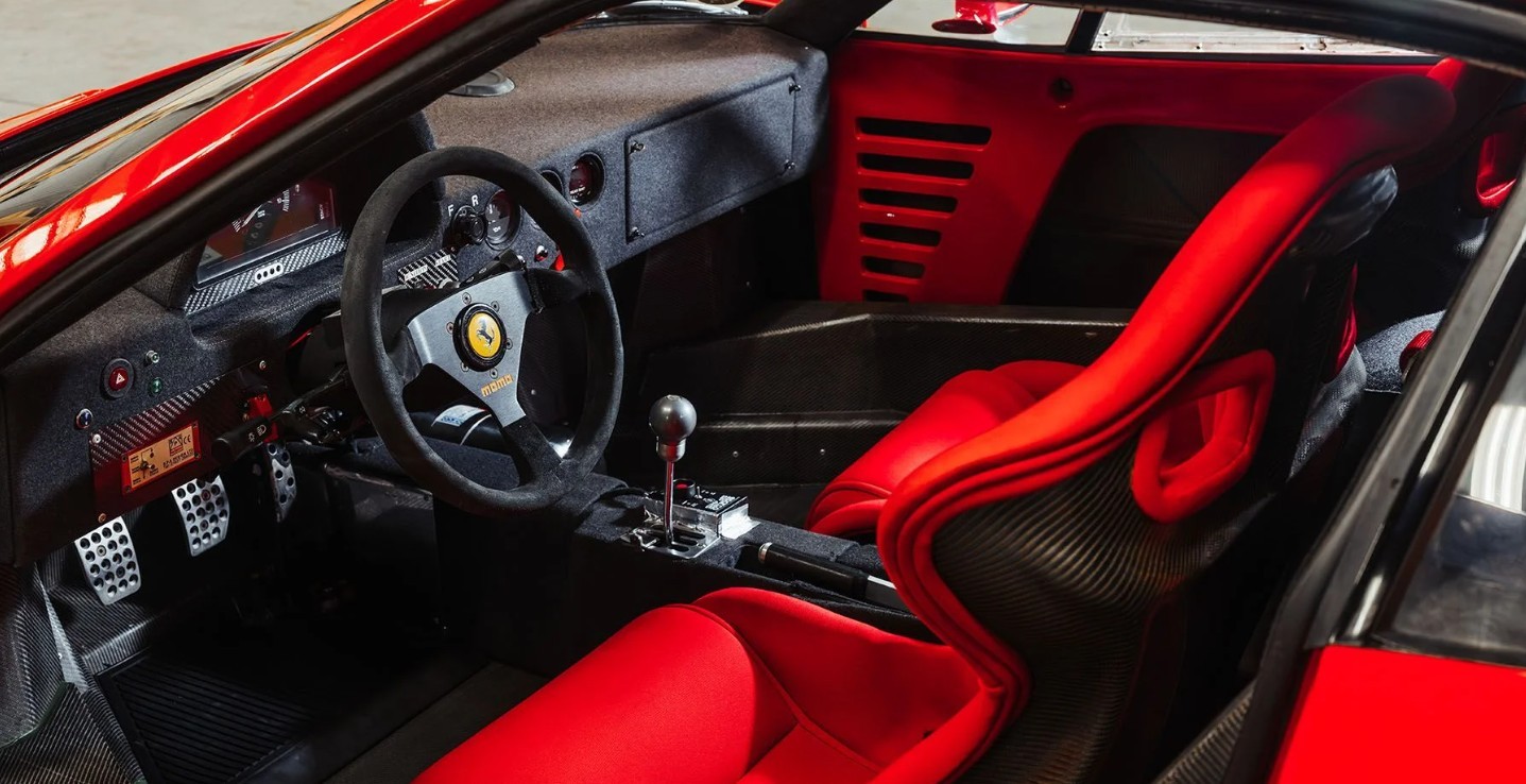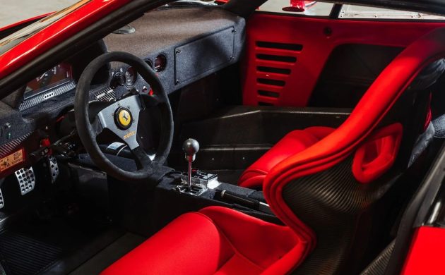 A Ferrari is so much more than its motor, but hey, we’re not going to skip this part! The F40 was normally supplied with a mid-mounted, 2.9-liter, twin-turbo V8, good for 471 hp. But on the track while competing for the British GT Championship, that simply isn’t enough. The Martin Shaw build brought output up to 648 hp and 560 ft-lbs of torque. Now, that’s an engine. The suspension, brakes, fuel system and bodywork have also been upgraded to handle the stresses of this high-speed monster. The turbos and intercoolers were rebuilt. The gearbox is a five speed manual operating through a gated shift.