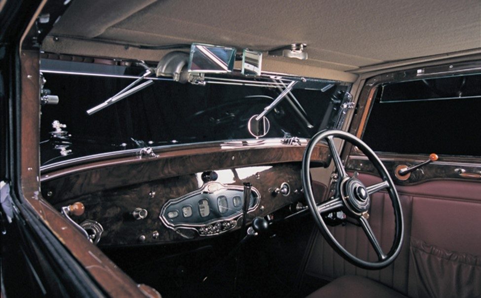 Here in our subject Stutz, there is mahogany or similarly stained wood dash with non-1929 instruments, yet keeping some of the original knobs, with a Bluemel steering wheel, not typical of Stutz cars in general. The photo below shows a more traditional 1929 Stutz interior with right-hand drive: