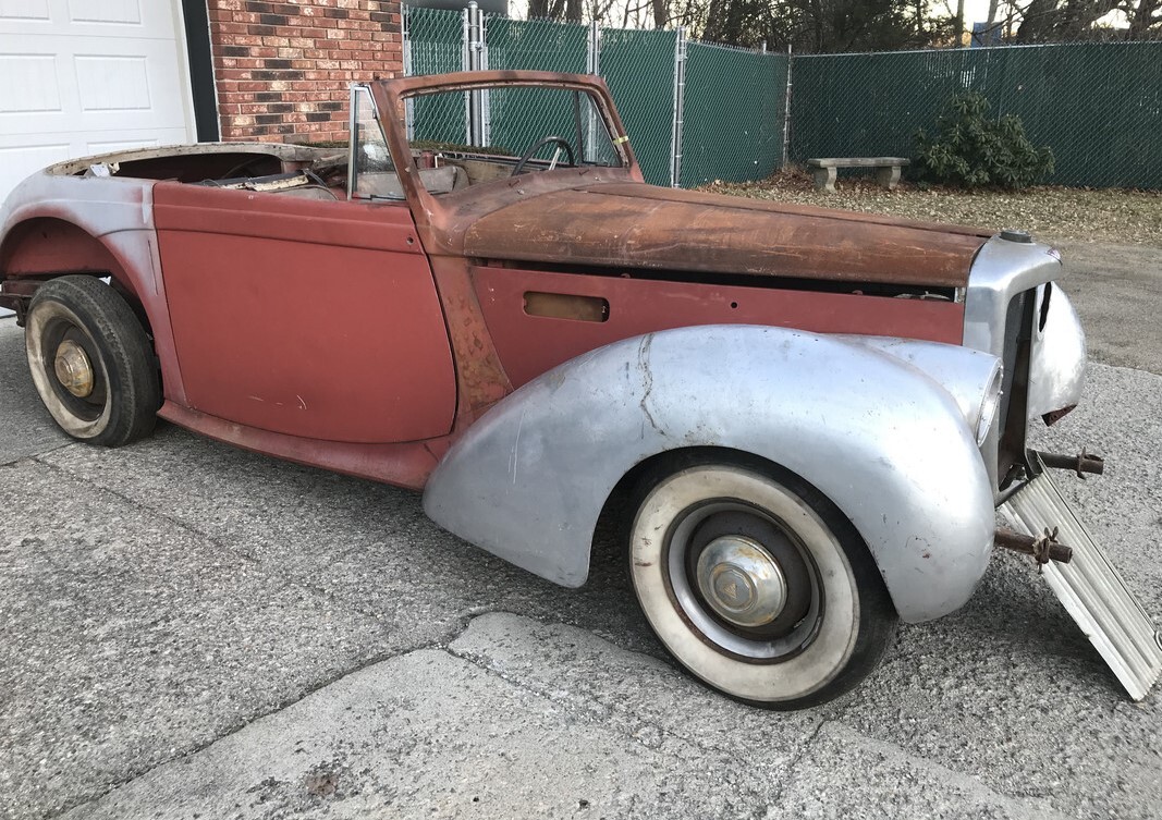 I never realized how rare these were untl a few months ago. A friend of my grandfathers has the sedan version of one of these in the 50s and 60s. I loved it, sliding metal sunroof, suicide doors, Lucas trafficators. He sold it in the 70s of $250. Without asking me. 30+ years ago we moved to Vermont and I met a Dr in Keene that had a Bentley and a later Alvis TF-21. Then last year a friend of mine from high school, who has 70+ cars, bought a convertible like this one. Very nice condition, I think he paid $28K for it.One year, one of the sedans was raced at Goodwood. I guess they race anything. https://www.youtube.com/watch?v=H1SCmSoEImY&t=254s