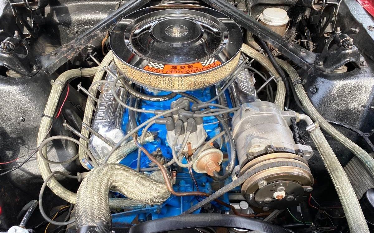 The 225 HP A-code 289 cid (4.7L) V8 could only be topped by the 275 HP K-code 289. This one sends power rearward through a three-speed automatic gearbox. Though not factory-stock, the engine compartment could be made that way if it’s important to the new owner.