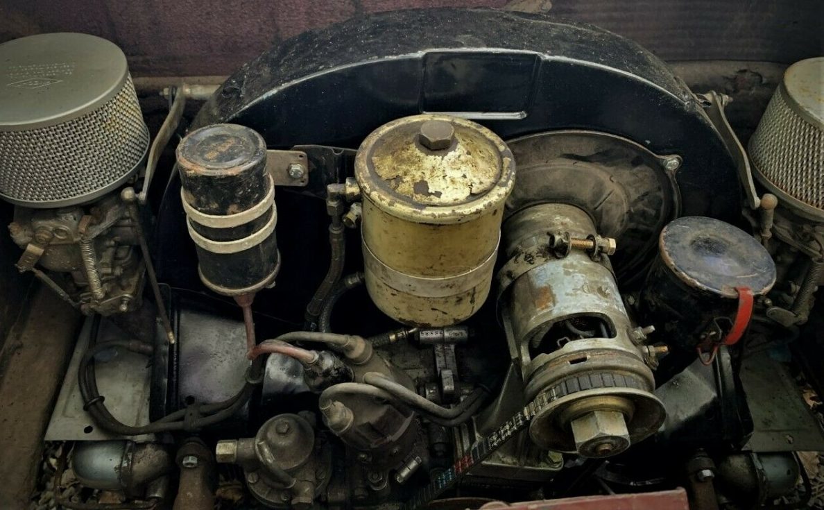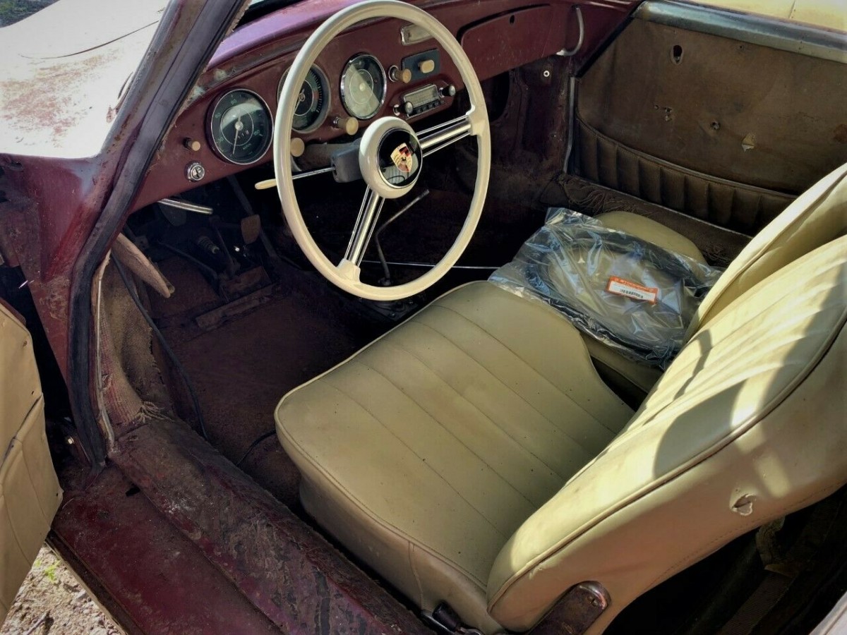 The interior appears to be in reasonably good condition, with the seller noting many original details still present and accounted for. These include the original glass, dashboard, Banjo steering wheel, window and door handles, and more. The listing also mentions the original “baby moon”-style hubcaps are included, which is a great look on these older 356s when paired with a set of OEM steel wheels. The seller does not disclose the condition of the floors or the sills, two areas that are vulnerable on almost any era of 356.