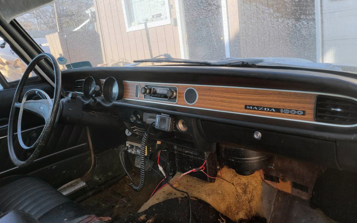 Oddly enough, after all the talk about Mazdas being driver’s cars and manual transmissions, this one has an automatic transmission with a column-mounted gear selector, the exact opposite of driver engagement. This car was recently purchased from the estate of the original owner and we don’t have any information as far as how long it’s been off of the road or stored or really anything at all. This is about the only real interior photo other than one showing the door panel, one showing plastic still on the sun visors, and a close-up of the dash. Yes, that’s a CB radio, very cool.