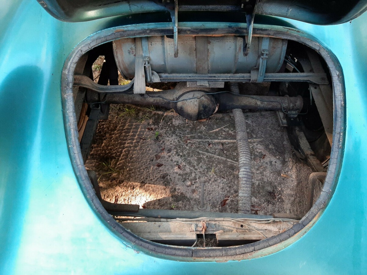 The interior features a lot of still-viable dark brown vinyl, and Stewart Warner gauges with slightly rusty chrome surrounds. Very little to do there. The carpet needs finishing, but it’s there in good condition. I’m not sure if these cars came with any kind of top, but this one doesn’t appear to have one—or any way to attach such a device. Maybe that was optional. The brochure that comes with the car explains that “aero-dynamics” ensure “closed car comfort” and hardly any wind noise. There’s no trunk floor, but that shouldn’t be too hard to fabricate–or maybe it’s in a box of parts.