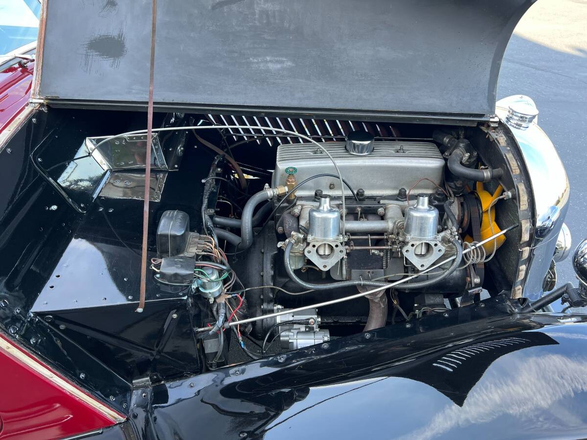 The +4 was introduced in 1950 as a larger-bodied version of the 4/4, and along with improved dimensions, it was given an improved powerplant. Formerly relying on a 1267 cc Standard four-cylinder, the new car earned a 2088 cc Standard Vanguard four-cylinder paired with a single Solex carburetor making 68 bhp. All +4s utilized the sturdy Moss four-speed gearbox. Later +4 cars will have one of several Triumph motors in residence between the front wheels, by now paired with twin SU’s. Note there is no room in the engine bay for an air filter. This car has had its brakes rebuilt and received a full service. It rides on new tires.