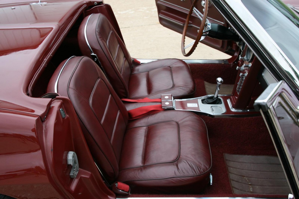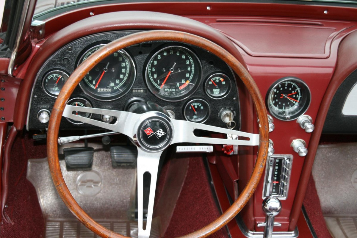 Opening the door on the Corvette reveals a beautiful Maroon interior, with the seats trimmed in leather. There are a few creases in the leather, but the seats themselves look to still be soft and supple. If I’m going to pick any faults, the most obvious is some wear on the rim of that fantastic Teakwood wheel. The rest of the interior really is close to perfect and is completely original. The owner also claims that everything; every gauge, every switch, every light, all works perfectly. It really does seem that this Corvette is a car that contains no bad news for the next owner.
