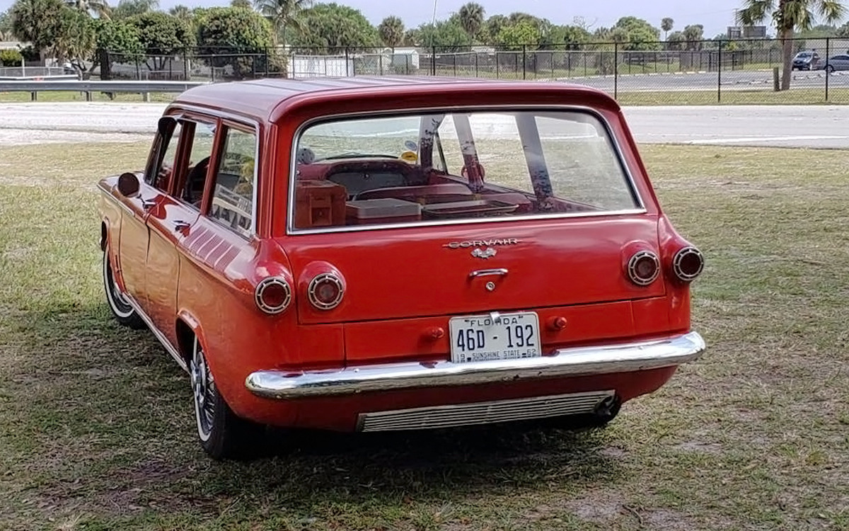 This car has an automatic transmission which would have been GM’s two-speed Powerglide. It appears that this car has the crossed-flags logo on the rear hatch door, so this engine should be Chevy’s “Super Turbo-Air” 145 cubic-inch flat-six which would have 102 hp. The “Turbo-Air” engine with 84 hp was the standard engine for automatic-equipped cars and manual transmission cars had 80 hp as the base engine. Have any of you owned a Corvair wagon?