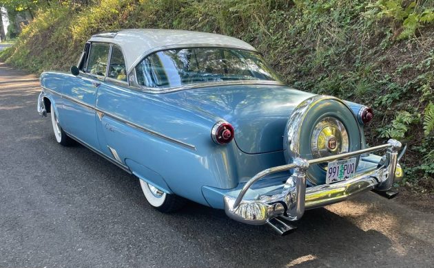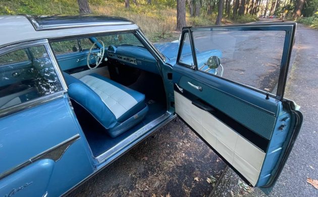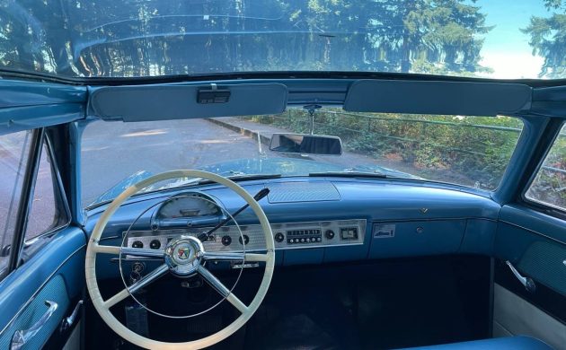 This handsome hardtop was purchased by an older gentleman from Matthew’s Memory Lane Motors in Portland in 2018. The new owner invested in several cosmetic and drivability upgrades, with the biggest being the professional installation of power steering and power brakes. To say the least, even though it is described as an older restoration, this ’54 Skyliner presents very well with its glossy Cadet Blue metallic paint and contrasting Sandstone White roof (and period-correct whitewalls). All the chrome, trim, brightwork, glass, and lenses look great, as does the distinctive “freshness of view” blue-tinted acrylic glass panel over the front passengers. I also read that 107 Dealer “Demo Hood” models were produced to show off the ’54 Ford’s new Y-Block V8. The Skyliner’s hood had a clear panel above the engine and bay lighting was added to better illuminate the new engine on the showroom floor. I wonder how many of those are still around?