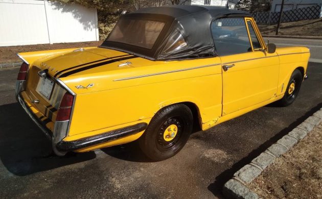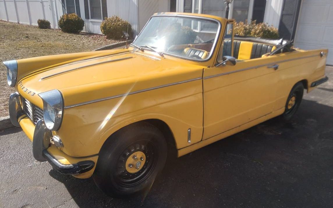 In 1956, the Suez Canal Crisis spiked gasoline prices, particularly in Britain, but throughout Europe. In Britain, gasoline was rationed. This sobering experience galvanized auto companies: the drawing boards came out and small, fuel-chintzy cars took shape at BMC, Standard Triumph, and Ford Europe. Triumph’s entry – penned by Giovanni Michelotti – was the Herald, a body-on-frame saloon powered by a tiny 948 cc four-cylinder and designed to accommodate four. A coupe was also available. Most of its parts came from the Standard bin, but the sheet metal was new and buyers responded well. Later, a van and a convertible were introduced. An engine upgrade in 1961 to 1147 ccs boosted output; christened the 1200, these Heralds are the sweet spot for many collectors. Here on craigslist is a 1962 Herald convertible in not-so-mellow-yellow, looking for a new home. The price is $3800 and the car is located in Farmingville, Long Island, New York. Thanks to Roger for finding this cheerful Brit!