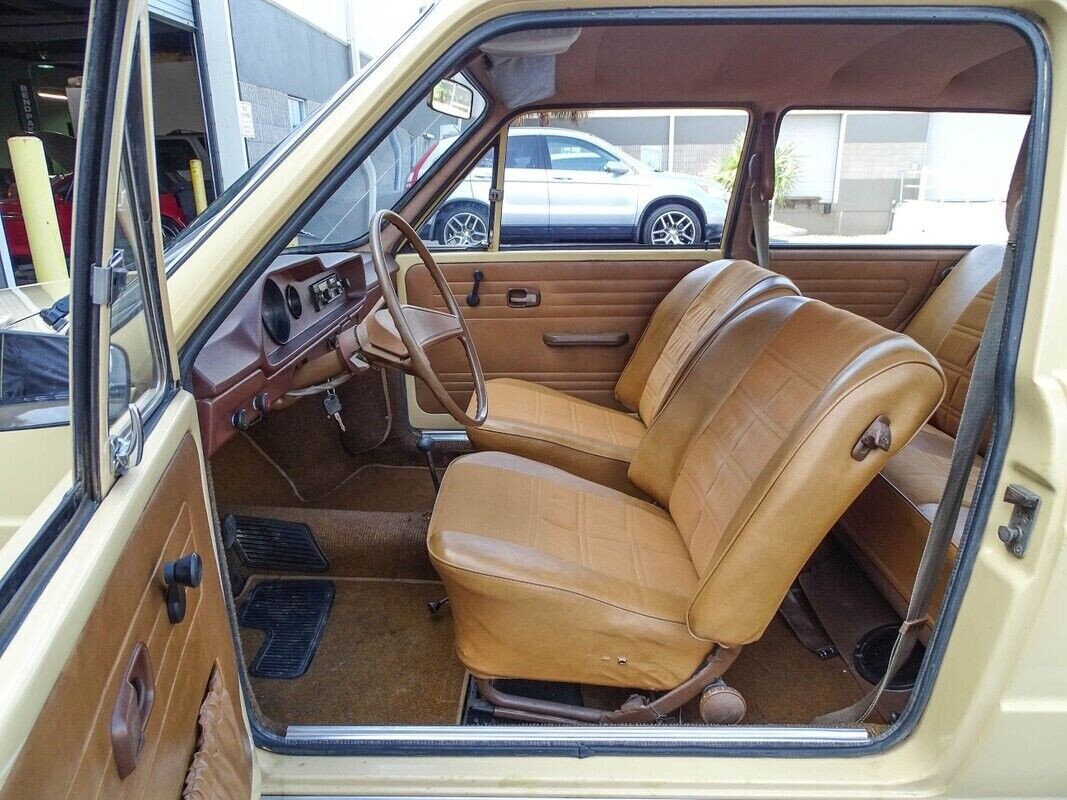 The Squareback is the closest model we had here in the states in terms of appearance, and in four-door form, the Brasilia looks near close to being identical. The two-door body really is distinctive, and the low-slung rear quarter panels really do sit on top of the back wheels. The rear hatch is almost elegant in design, and you lift that up with the glass as one piece so you can access the engine below. The steel wheels are classic VW/Porsche design, and I can almost imagine these same wheels on a 550 Spyder. The paint job is known as Marfil, which is a Spanish translation for Ivory.