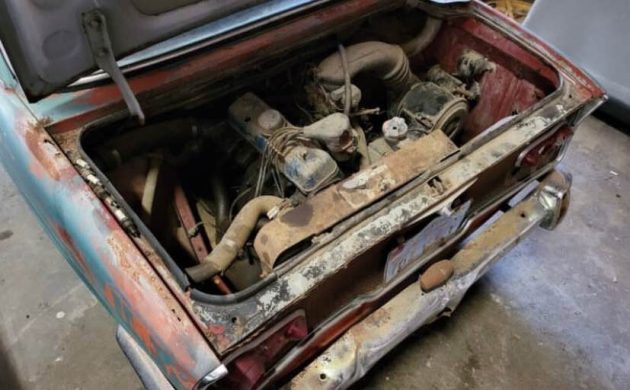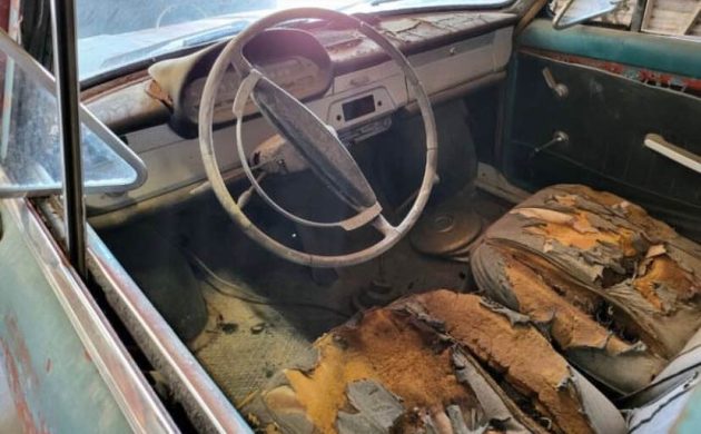 This vehicle could serve as a parts source for the seller’s coupe, but he must be flush on extras for that vehicle, as he’d rather see someone else restore the 4-door. The body seems okay with the faded blue paint accompanied by red primer. And the interior is beyond being in a salvageable state. No trades will be entertained, so show up with cash. Thanks for the tip, “JDC”.