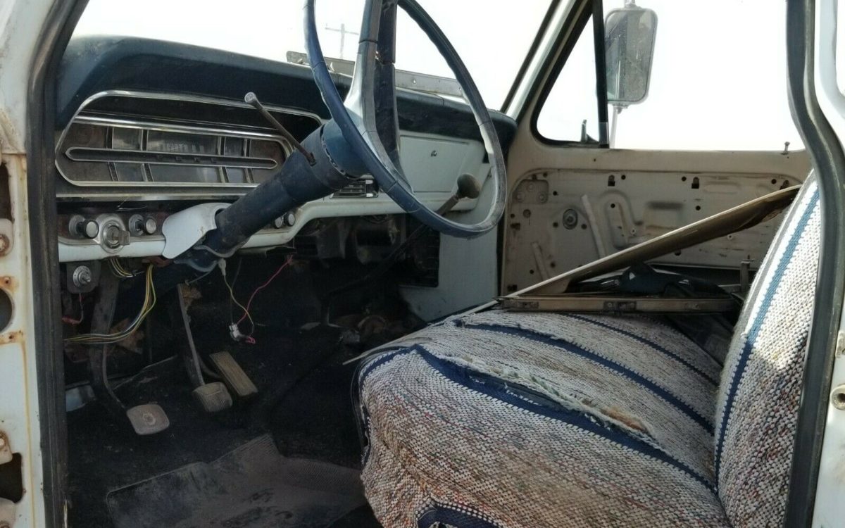 This truck is definitely a project. You can see the saddle-blanket seat cover (which almost seems to have been standard equipment for 70s Fords). Overall, it just looks like it needs a good cleaning and tidying up. There isn’t much information in the ad regarding the different body panels but they do say “…originally some sort of combination of blue and white…” It appears at least two of the doors and the driver’s fender are from a different truck. As stated before, the VIN tag would show you what color the truck was sprayed in from the factory.