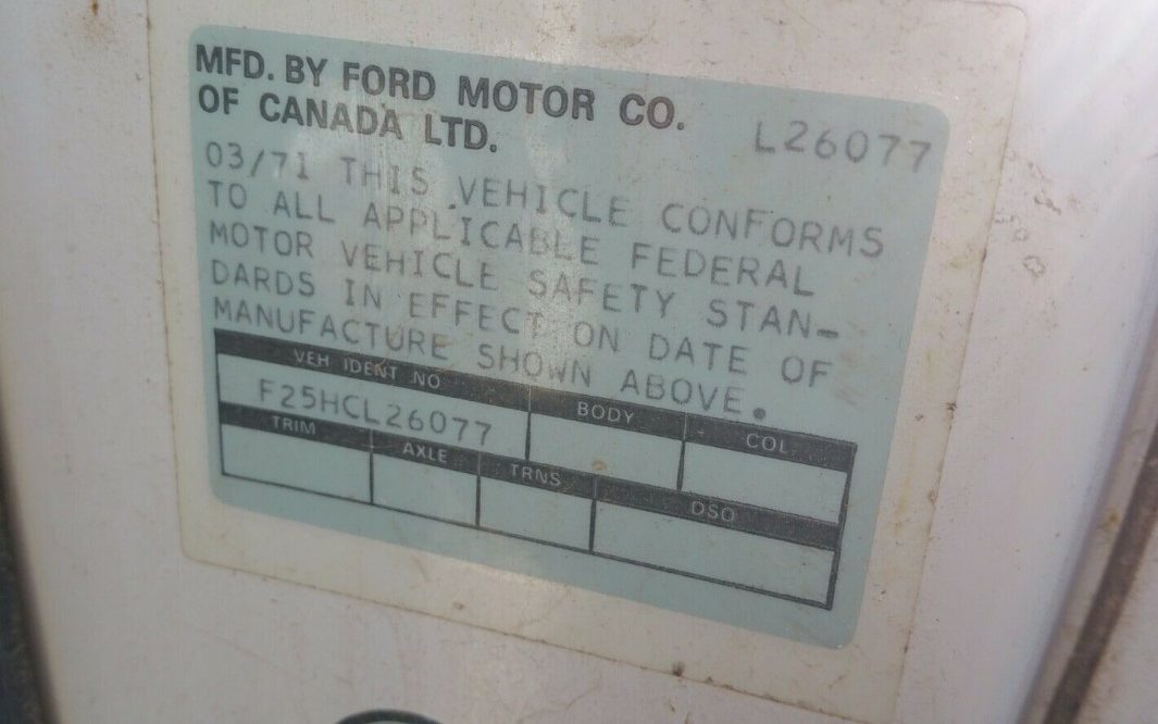 One really cool thing about this era of Ford is the ability to decode the VIN number and VIN tag to get specific “born-with” information. You can also dive deeper with a Marti Report which will tell you how rare the options for your truck are. This truck’s VIN is F25HCL26077. This indicates the following: F25 = F-250 2-wheel drive. H = 390 cubic inch V8. C = Ontario, Canada. L26077 indicates it was made in March of 1971. As you can see from the sticker above, the Canada information is confirmed along with 03/71. The VIN tag isn’t shown in the ad, but that would tell you a few more details like horsepower rating, color, and axle ratio, etc.