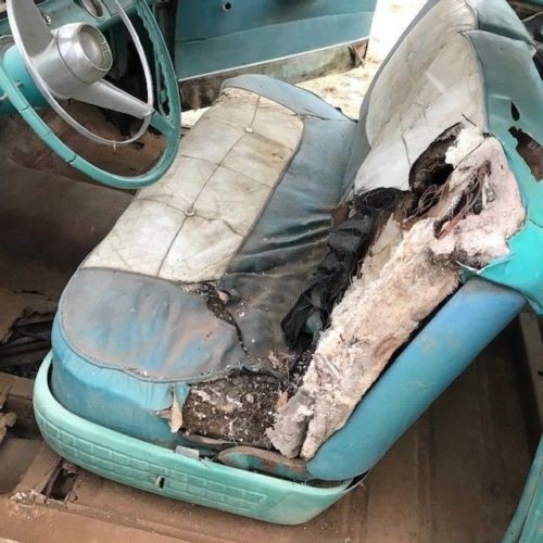 Inside, there is some rust in the floors, particularly on the passenger side and trunk. Dirt covers all the dash and any other interior surfaces. The rear seat bottom is missing and so is the driver side door glass. More glass is needed due to cracks, specifically the windshield and passenger side door. The listing also notes that there are lots of parts that come with the car, but since they were in the trunk when they purchased it, they are not sure if they actually go with the car.