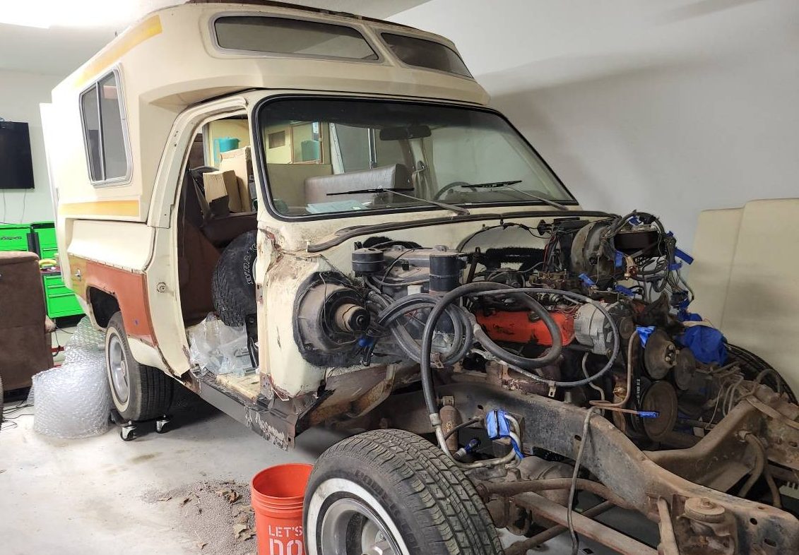 Photos show rust holes on the passenger side sill; the rot is less advanced on the driver’s side in the same spot. Overall, it could be far worst, but we’ve also not seen photos underneath the truck. The bed itself looks sound, and the same goes for the camper shell. The photos show the truck in a gradual state of disassembly, with the front clip intact in some photos and removed in others. In the photos where the fenders and nose panels are still installed, the passenger-side fender shows some minor rust while the driver’s side looks largely rust-free. Photos that show the doors still attached indicate those, too, are in decent shape.