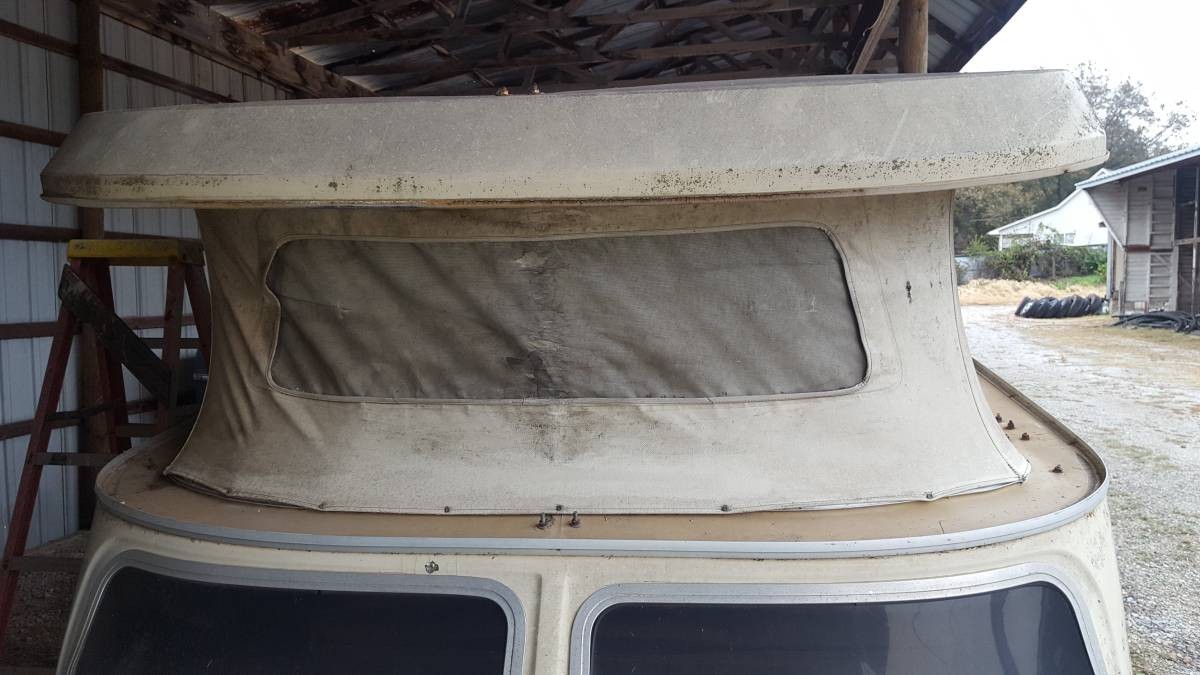 If folks saw the Oct 2017 Stillwater Oklahoma Craigslist ad for this #0466 Chalet back when it was still all assembled and roadworthy, they’d understand what the current “…all original except pop-up top” bit meant. Back then, it was likely that the pop-up roof had been completely blown off the rig in some form or another of a catastrophic manner and that the owner or prior owner had replaced it with a hand-fabricated sheetmetal roof. What this current seller has accomplished after he bought it was locate a tan-colored fiberglass 1977 model year roof from some parts Chalet rig somewhere. That’s the warning I try to tell any seller, that when going down the road, the spring-loaded pop-up roof may spring open if it is not tied down with the 5 interior factory straps. It’s why you see various ones with big outside aftermarket clamps on the upper sides to hold the roofs down, and why you sometimes see parked ones with a big strap over the whole roof.