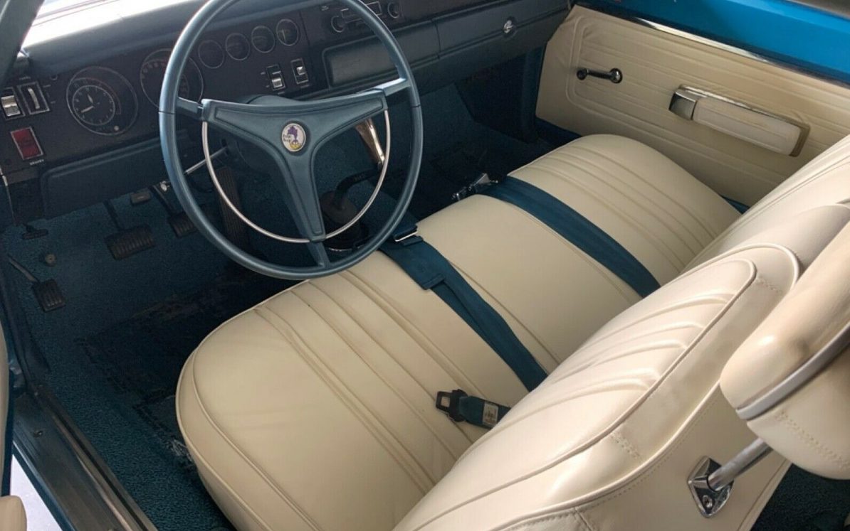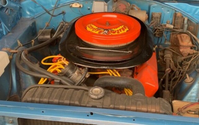 The exterior is a repaint in B5 blue and it shows very well with a deep, rich shine. The black hood stripe is strong too though a coating of dust might make one think otherwise. The exterior images of this Plymouth aren’t great, with a $60 large BIN price, one would think that at least the seller could move the car out into the light where it can be fully observed. Ditto the white top, we’re told that it “goes up and down great” but there is no reference to condition. Of note is the air grabber hood, one of Plymouth’s more memorable performance enhancements from the era. There is one image of the underside included and it looks trouble-free, and probably, recently recoated.