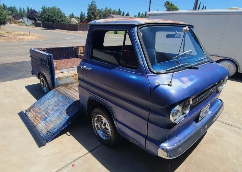 Whether you loved or hated the VW Beetle, there’s no question it kicked off a round of innovation at US automakers. AMC put its Rambler American “subcompact” on the ground in 1958; Ford introduced its Falcon in 1960; Studebaker had its Lark; and Chevrolet came to the table with the Corvair. Of these four, the Corvair was the only groundbreaker. It was not just a smaller version of an existing sedan powered by some thrifty six cylinder. Like the Beetle, it carried its air-cooled engine in the rear. But unlike the Beetle, its sedan body provided scads of room for passengers and luggage. Later, body styles proliferated and turbocharging spiced up the performance, so the Corvair could cater to almost any need. Here on eBay is one of the two pickups offered – a 1961 Rampside. Bidding has reached $9100, but the reserve is not yet met. Retrieve the truck from Atwater, California – and reading between the lines, a trailer might be a good idea.