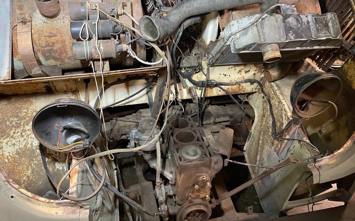 Motivational power comes from an unusual source in the form of a 32 HP, 900 CC, in-line, three-cylinder, two-stroke engine. The seller advises that it doesn’t run which is no surprise considering that it is apart. He adds that he has a spare engine included in the sale. Gear changes occur via a column-shifted, four-speed manual transaxle.