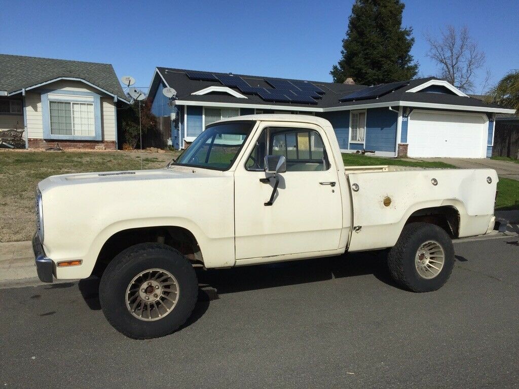 The seller tells us the tale of a third-generation D-series 4wd with 360 V8 and automatic transmission, which started its life green but was at some point painted white. This somewhat-rare short bed Power Wagon got inebriated and bumped its left backside cheek into a Semi, causing its owner to lose his license.