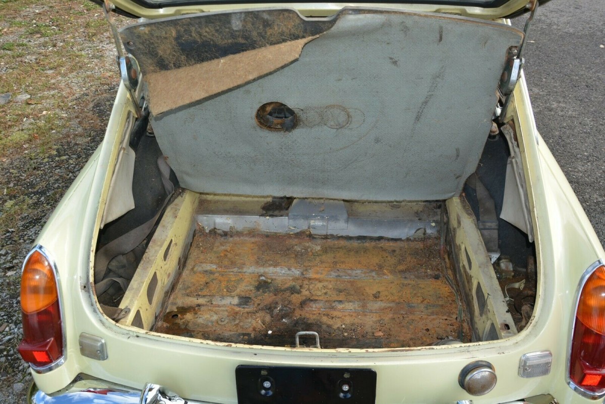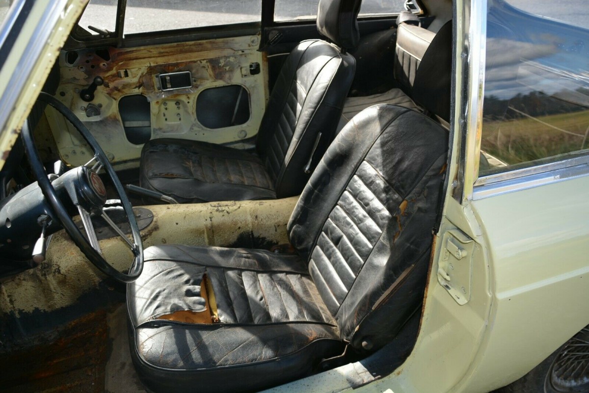 The body of this car is fairly tidy. The owner, who also has some other British project cars (including two other MGs and a Triumph Roadster) says this MGC-GT (with the seldom-ordered factory automatic) was last driven in the early 1980s. The motor turns over, but it hasn’t been started in recent years. Metal work was done circa 1984, but the poor car never got put back together. The unrestored seats are in place. The rest of the interior is present as a parts collection, but it’s all fairly rough. Some trim is AWOL but I bet it’s around somewhere.