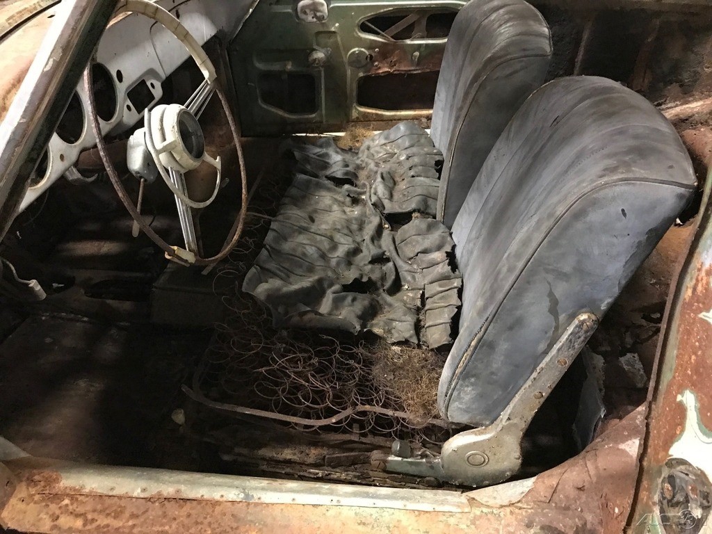 Inside is where the true rarity of the car comes forth. It is installed from factory with a bench seat up front. While there does not seem to be much left of it, there is enough to start restoring it back to the suave gray interior that it used to be. There will be lots of sheet metal needed to patch the floors and other areas of the car before any cosmetic or mechanical work can begin.