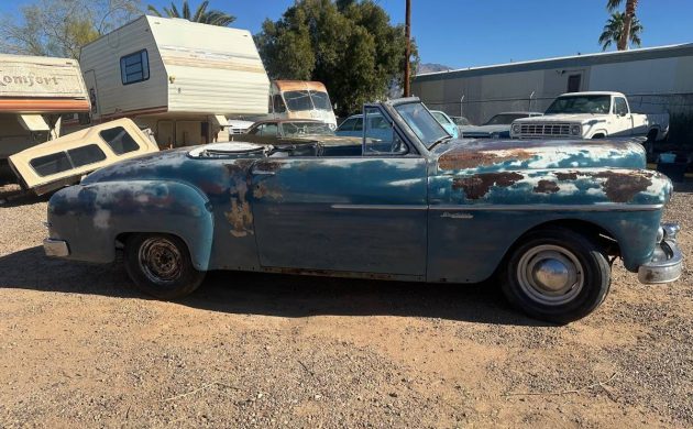 Dodge’s Wayfarer, offered from ’49 through ’52, was available in three different body styles: three-passenger coupes and roadsters as well as a six-passenger two-door sedan. Those three models equated to a total Wayfarer production of about 75K copies in ’50. In addition to the standard roadster, there was a “Sportabout” trim level offered too and that’s what we have here. Unfortunately, I wasn’t able to determine the production volume for this trim and badging option. Right off the bat, we’re met with some rather extreme patina that appears to have been preserved with a clear coat. Whether that’s really the case or not, can’t be determined from the images but that’s how it looks to my eyes. And, I question if that patina has been “gigged” a bit as opposed to being the result of natural environmental conditions and age. Rust is apparent, and as the seller states, the worst of it seems to have affected the rocker panels. There appears to be a convertible top frame still in place, and the seller acknowledges as much but the fabric is likely long lost to the ages. Beyond that, there are smaller issues such as missing lenses, etc.