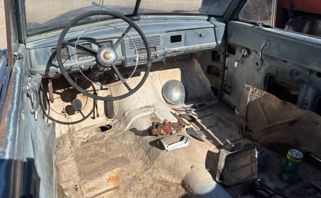 The interior is gutted which affords potential buyers the ability to review the floor pans – they look pretty good. That’s the good news, the bad news is that there’s really nothing there, save for the dash, instrument panel, and steering wheel. There is a single bench seat but it’s probably the worst excuse for seating that I have witnessed. The seller states, “Seat frame is there and needs reupholstered as is the top frame.” Yes, it needs to be reupholstered – at the least, and a whole lot more than that.