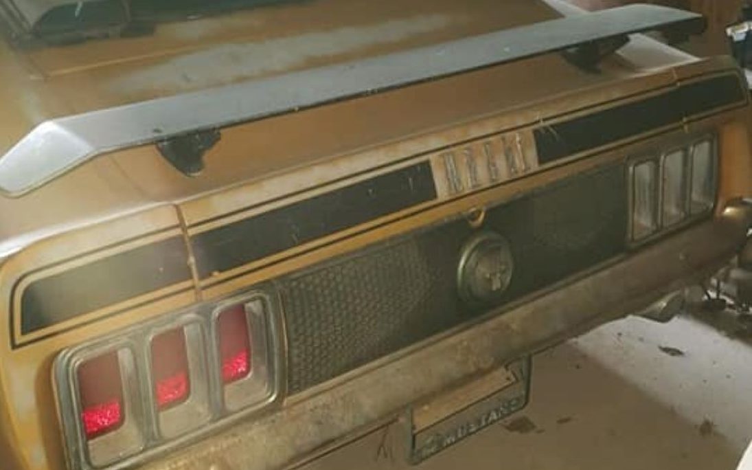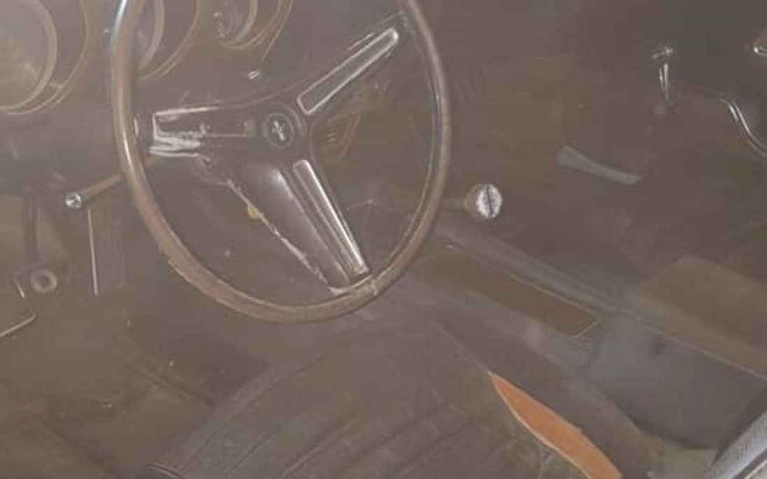 This example is listed as a twenty-four-year barn find having been parked in 1996. The Bright Gold Metallic finish appears as faded but it could be just obscured by dust. The leading edge of the hood appears to have some weirdness occurring but the image is not clear enough to discern exactly what it is. The same goes for the passenger-side quarter panel, it seems to be decorated with some surface rust, and possibly pushed in, but the image is too poor and distant to know with any certainty. Both bumpers are pretty deteriorated from a finish perspective with the front one showing indications of a lot of rainwater run-off. All-in-all, the exterior is intact and complete with a shaker scoop, spoiler, and rear window slats. This Mach I also has its original wheels which the ’70 Mustang sales brochure refers to as “die-cast center deep dish sport wheel covers”.
